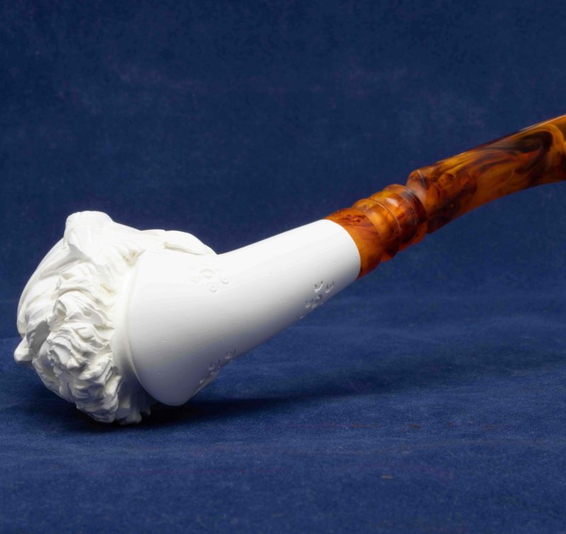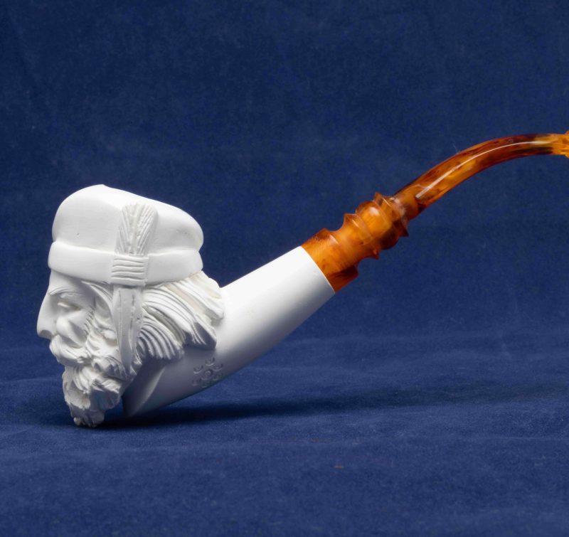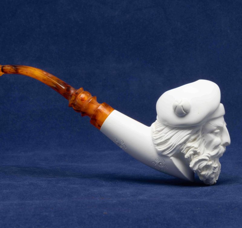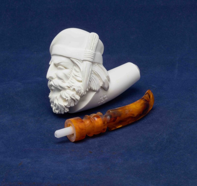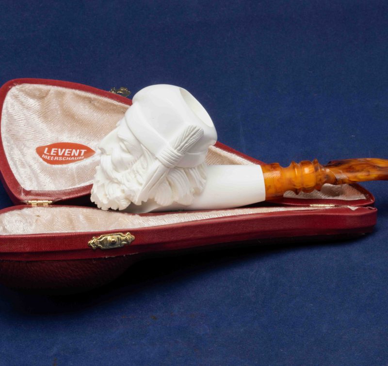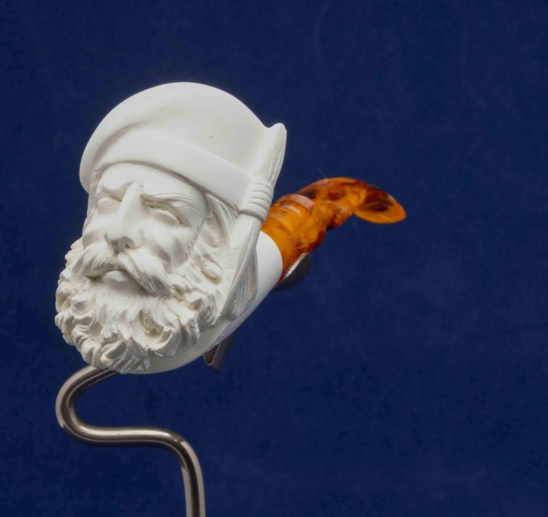 Cette pipe courbe a été réalisée à partir d’un véritable bloc d’écume de mer turque. Un foyer conique se cache dans une tête d’homme que nous attribuons à la Renaissance.