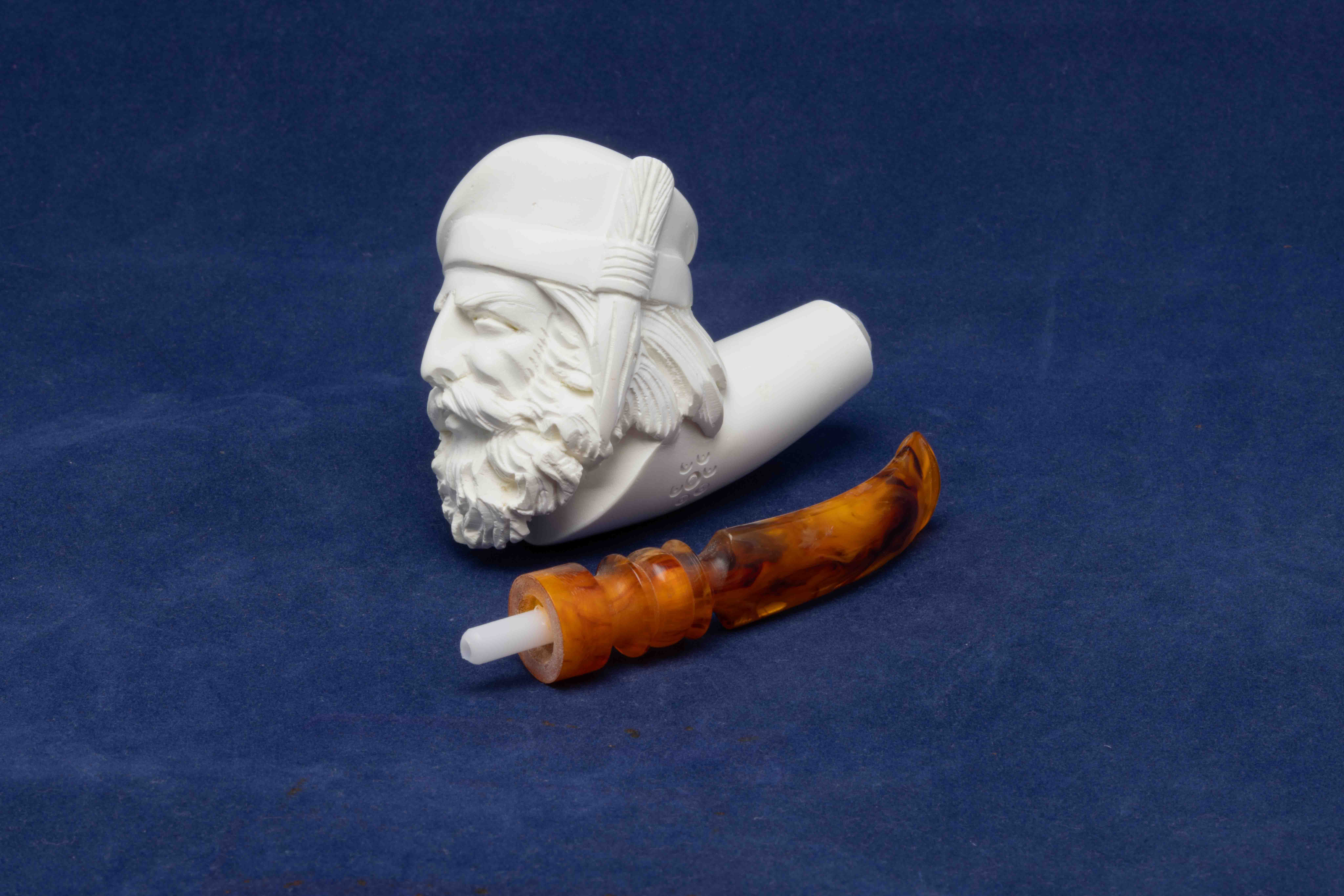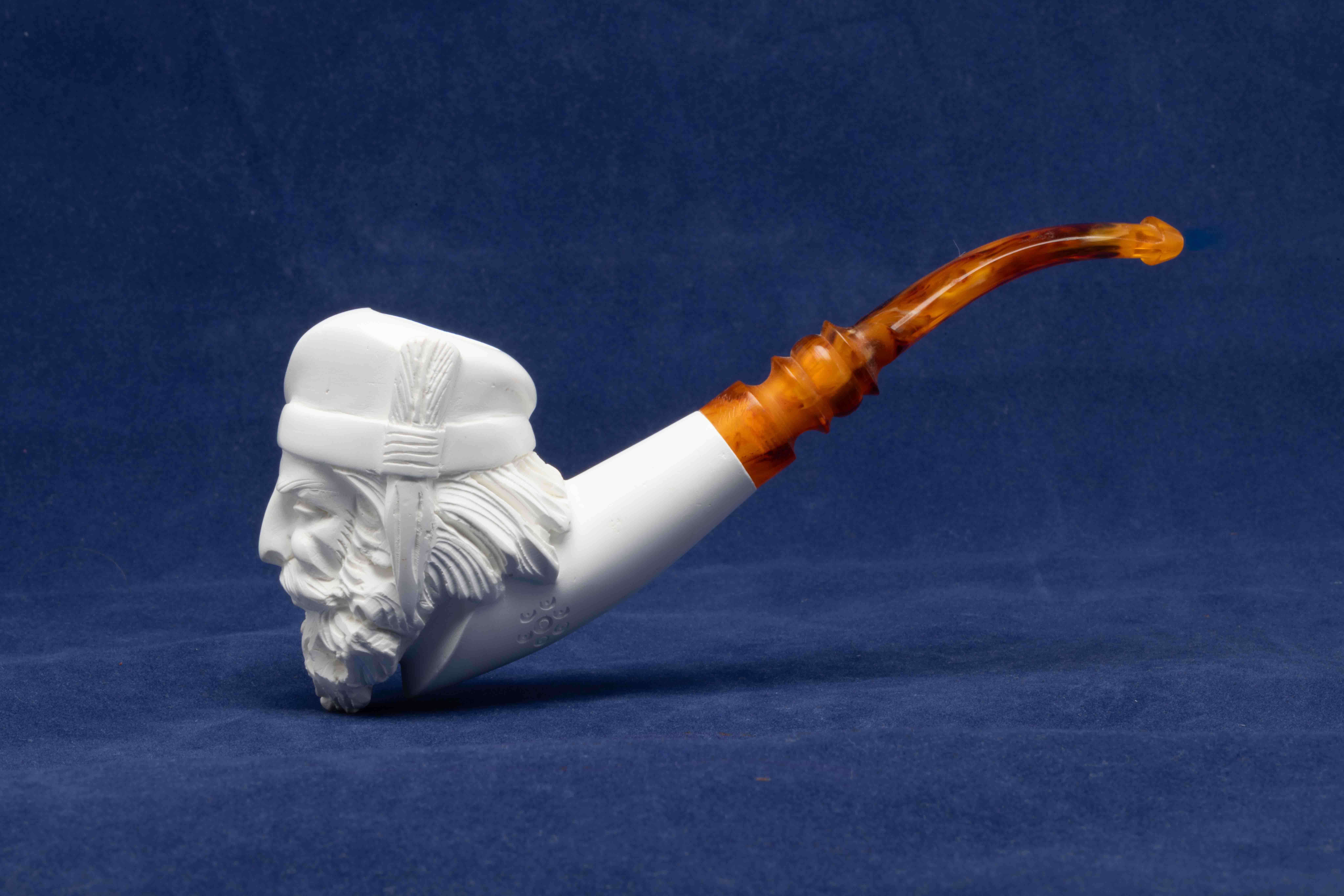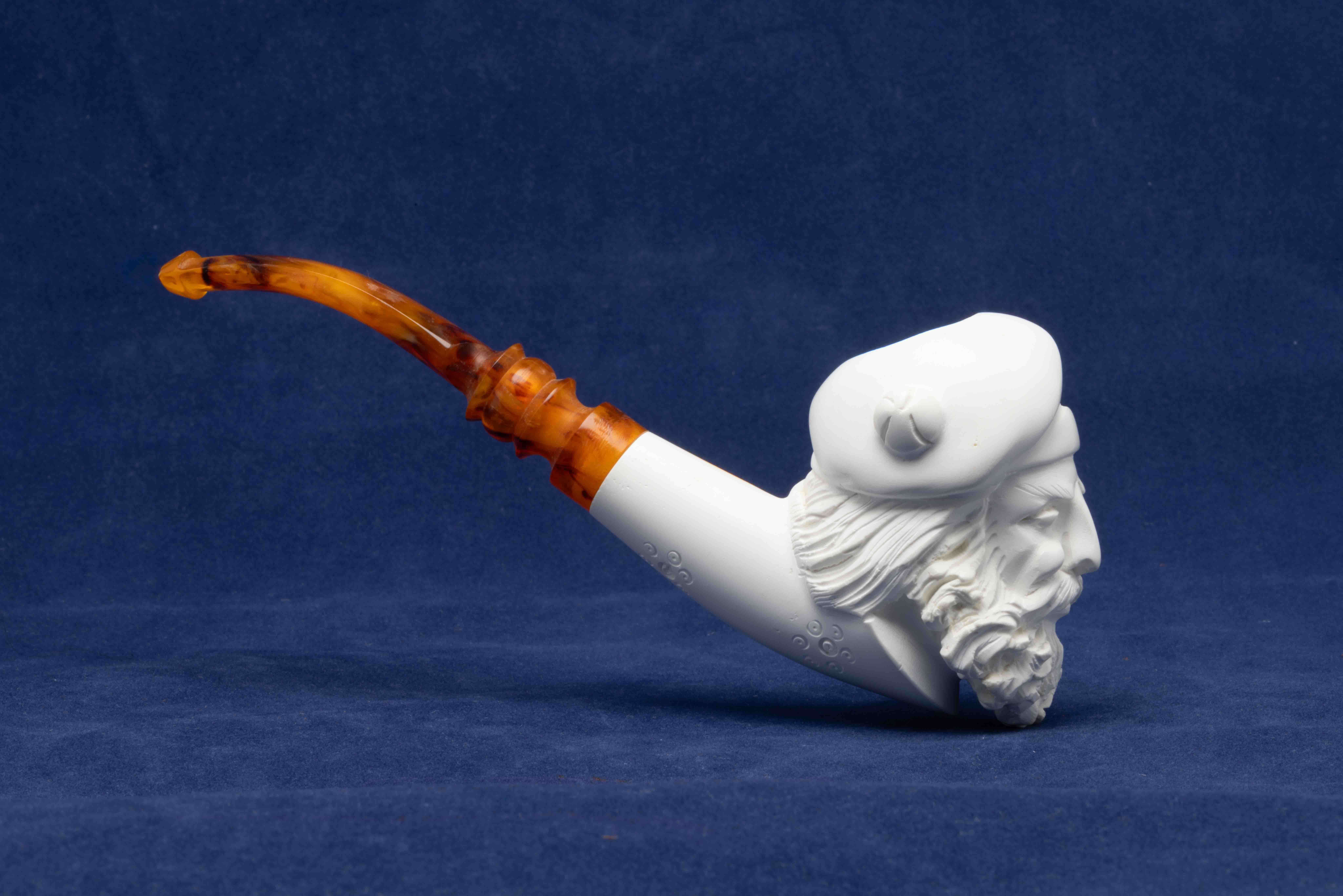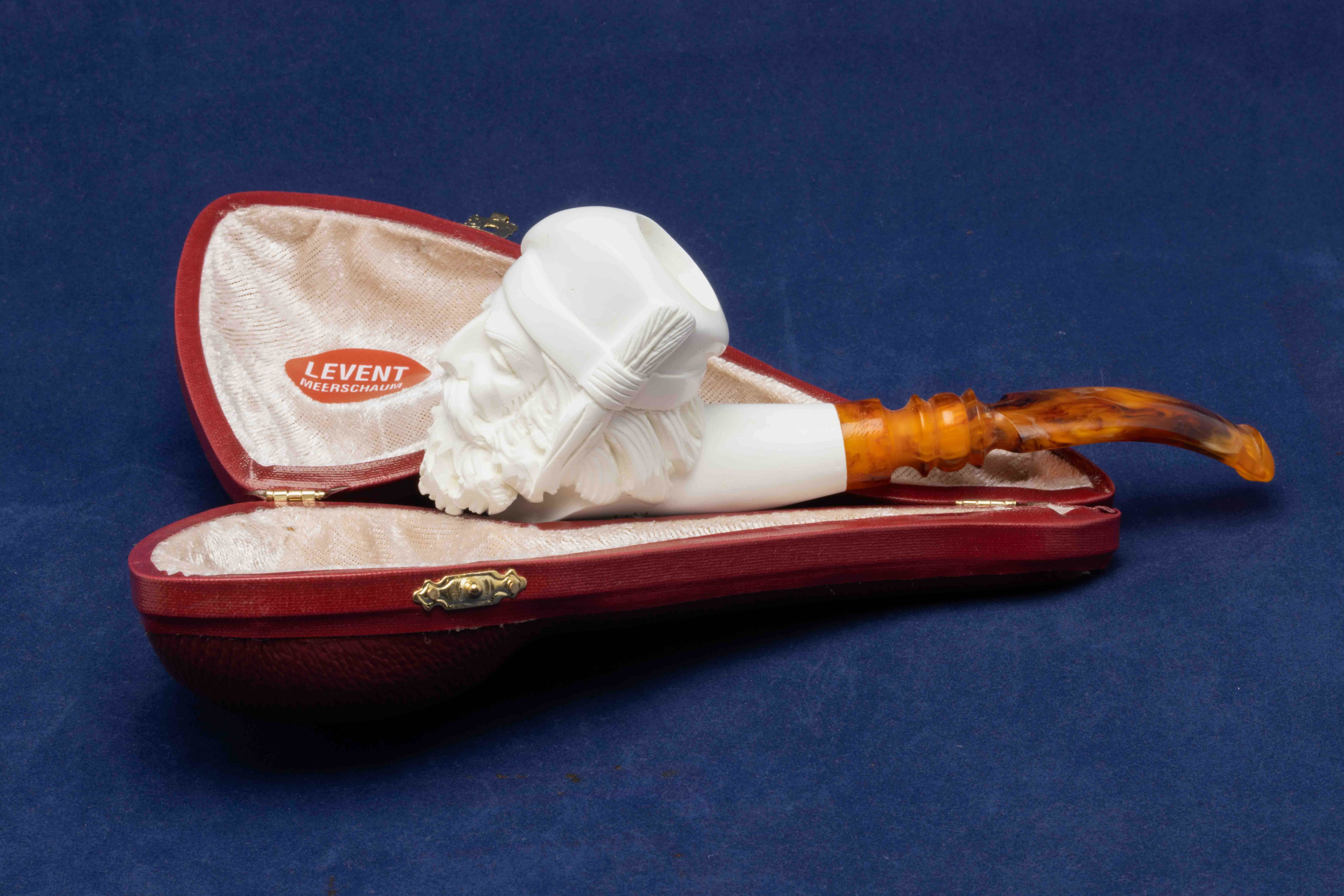 Cette pipe courbe a été réalisée à partir d’un véritable bloc d’écume de mer turque. Un foyer conique se cache dans une tête d’homme que nous attribuons à la Renaissance.